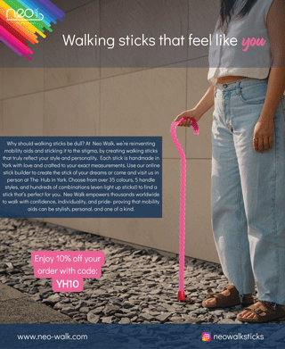 Lyndsay founded Neo Walk following a life-changing experience in 2010 when she lost her leg to a catastrophic MRSA infection. Faced with the need to use a walking stick, she was frustrated by the dull, clinical options available. Determined to reclaim her sense of style and confidence, Lyndsay began creating her own beautiful, acrylic walking sticks—vibrant, stylish, and unlike anything on the market.